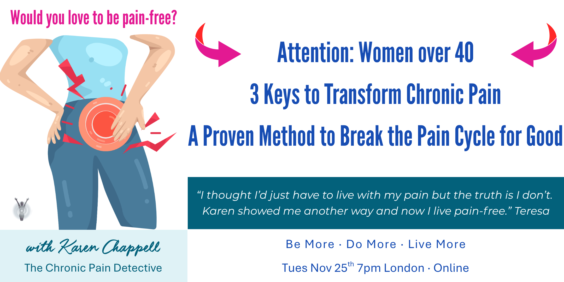 Join me, Karen Chappell, founder of the Bodylogiq® Approach, for a free 60-minute masterclass that reveals why your pain persists and how to end it gently and safely.